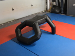 The first thing you can’t help but notice is the hexagon shape that simulates a closed guard. Never has there been a grappling dummy designed to mimic this very significant position in jiu-jitsu. But, we’ll get back to that aspect later to mention the very stable, welded steel-frame underneath the dummy’s exterior padding. The entire shape of the BJJ9K was thoughtfully designed with other key details such as the head being tilted at an angle to simulate a live opponent who would not be allowing their head to touch the mat in a real grappling scenario. The arms are also fixated in a way that will allow the BJJ9000 to stand on its own in a simulated turtle position and able to bear the weight of any size grappler, from child to ultra heavyweight.
