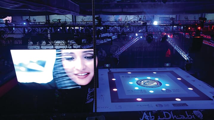Once inside the arena, I met up with Alessandra who is one of the organizers involved with the UAEJJF. She kindly guided me to the media lounge where I would pick up my press credentials. The lounge was located on the top level of the arena and offered a bird’s eye view of all the action at hand. National media was present to broadcast the matches, effectively putting the sport of jiu-jitsu directly into the living rooms of all of the citizens of the United Arab Emirates (UAE). Imagine that for a moment. A culture that reveres jiu-jitsu so much, they make household names of jiu-jitsu athletes. Could the seed of Olympics dreams for jiu-jitsu be sprouting in Abu Dhabi? Seems that this could be the best guess of any.