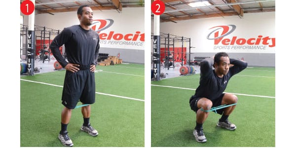 Once you have achieved strength with ground exercises, proceed to standing squat with band just below patella level. Start will light band resistance. Squat down while maintaining force against band. This will aid in glute activation. Make sure knees guide over 2nd and 3rd toes during squat. Attempt to squat below parallel with torso in line with shin angle.