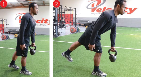 The position and form is same as single leg RDL, but with kettle bell in hand. Place kettle bell in hand that is opposite of stance leg. Form is same. Make sure that bell is held firmly with shoulders back.