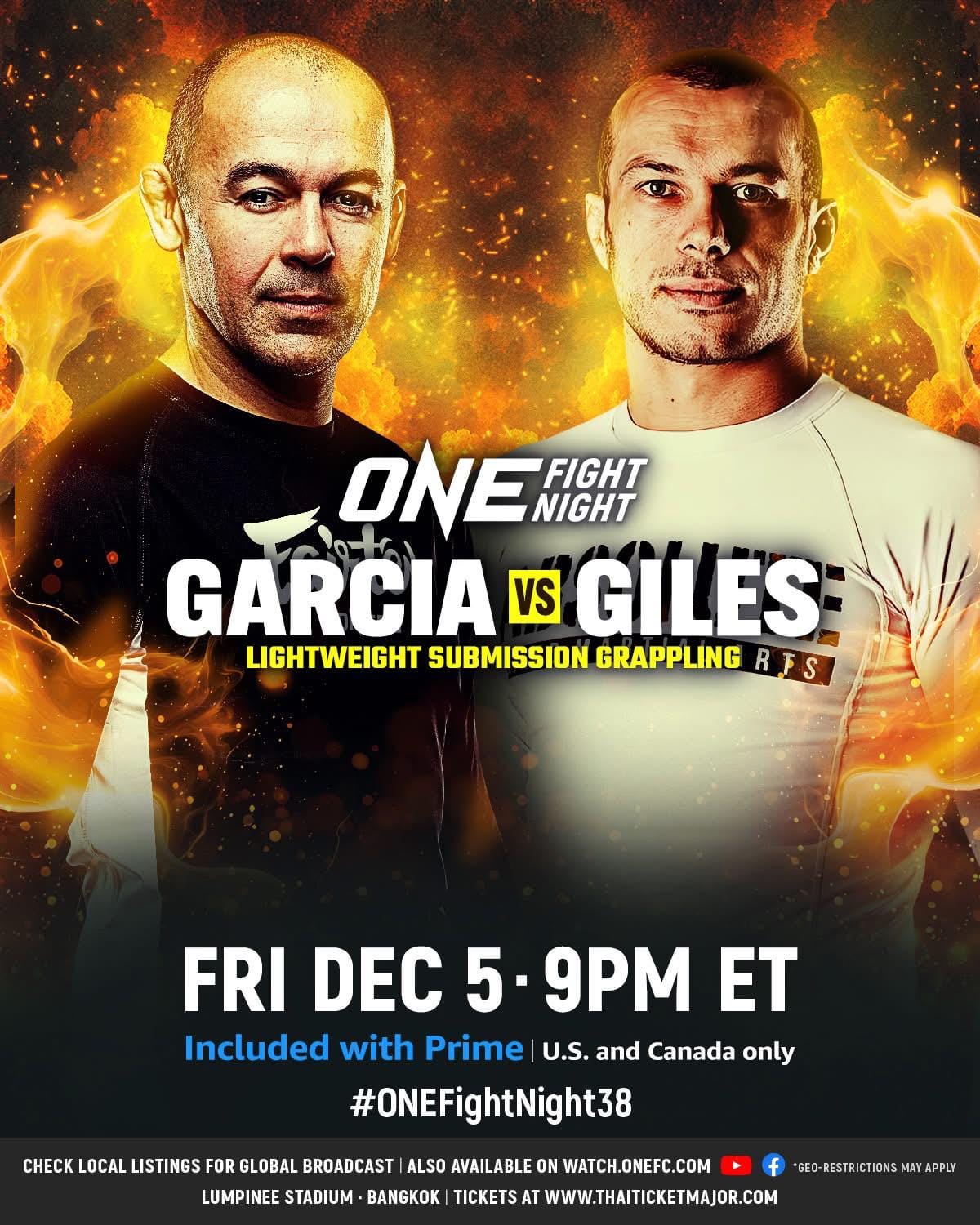 On Friday, December 5th, at ONE Fight Night 38 in Bangkok’s historic Lumpinee Stadium, jiu-jitsu royalty Marcelo Garcia returns to elite competition to face Australian technician Lachlan Giles in a lightweight submission grappling bout. The event streams live in U.S. primetime at 6pm Pacific / 9pm Eastern on Prime Video.