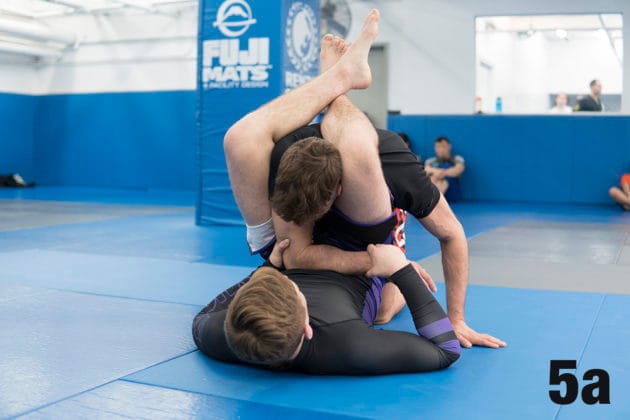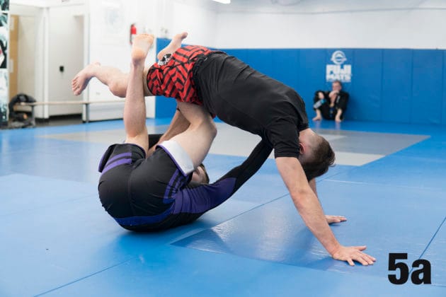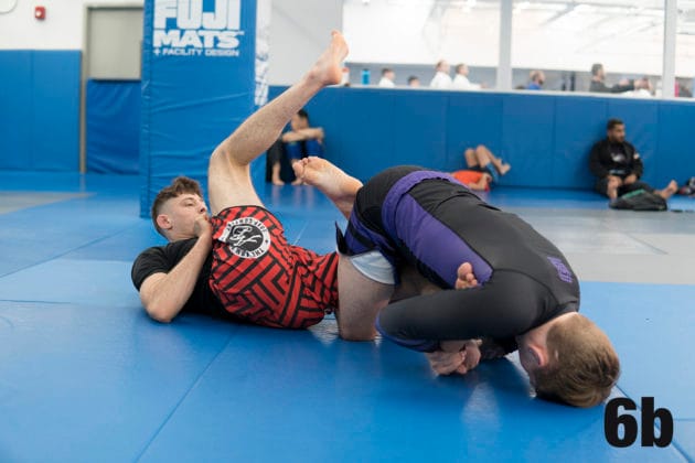 4. Nicky relinquishes his control with his right foot and wraps his leg around Ethan’s left leg, effectively exposing Ethan’s left heel.5a. As Nicky secures his grip, Ethan will begin to roll in an attempt to relieve pressure.5b.But Nicky will roll with him to his left, making sure to maintain his grip.6a. As they complete the roll, Nicky will bring his own heel to his butt…6b. … to allow Ethan’s leg to pass through…6c. … so that he can secure his legs to the outside and secure the submission.