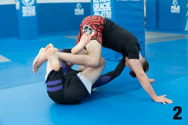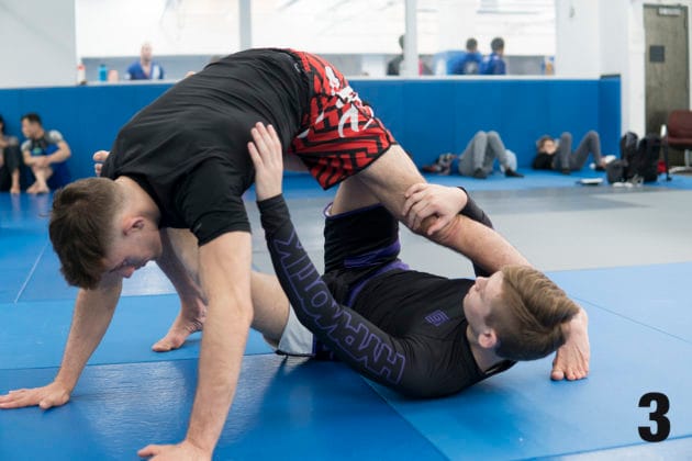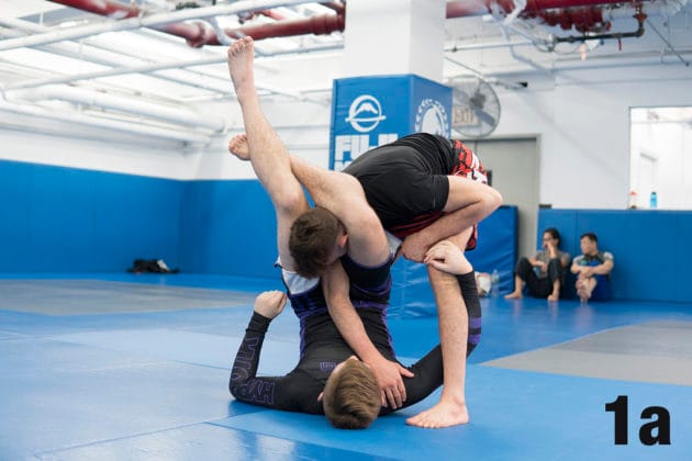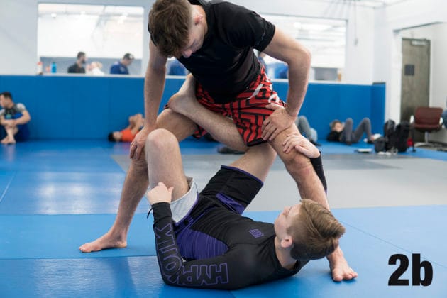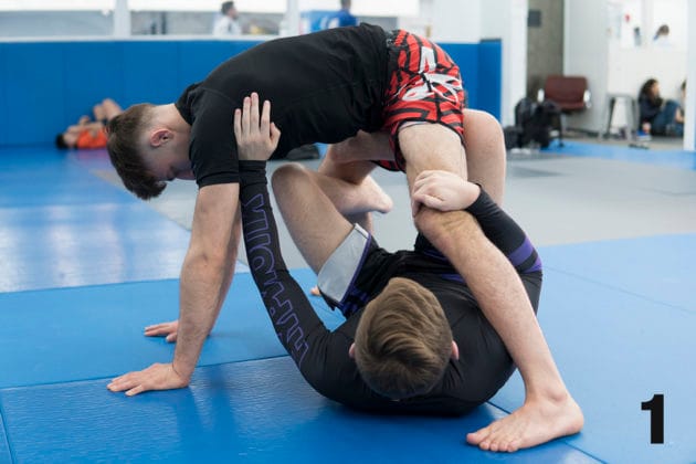 1. Using the same setup in the 1st five steps in the previous move, Nicky breaks down Ethan’s position, causing him to plant all four limbs onto the mat.2. From here, Nicky will use his right foot to scoop up Ethan’s right leg by placing the front side of his right ankle to the front side of Ethan’s right ankle and scoops his leg up.