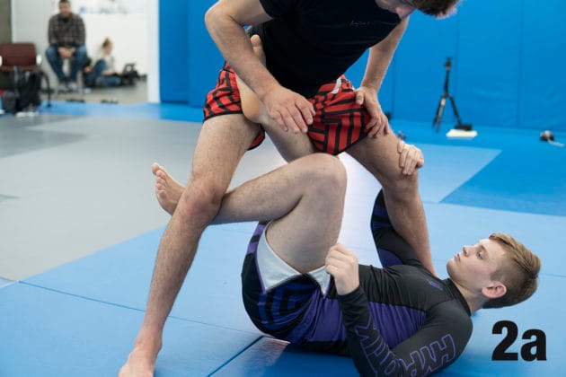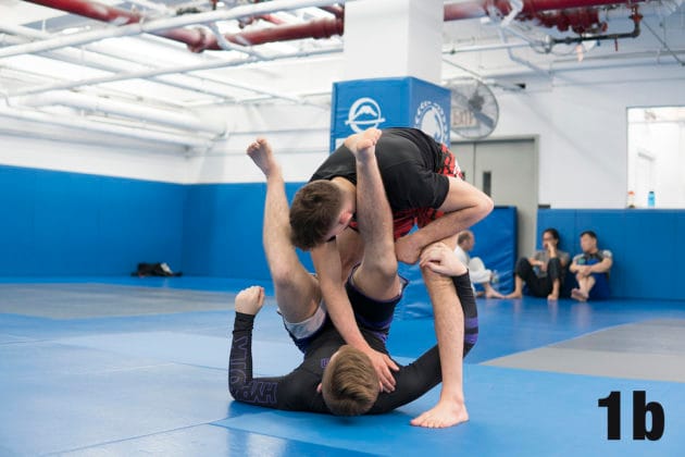 1. With Ethan in a supine position, Nicky will initiate the pass from the standing position by posting both of his hands on Ethan’s shins, smashing them into his chest.2. Nicky takes a cross-body step with his right foot, placing his foot inside of Ethan’s right thigh.3. From here, Ethan will hook Nicky’s right leg, creating a Reverse De La Riva Guard situation.4. Nicky will now pummel his hand to Ethan’s hip while his other hand…4b. … pushes Ethan’s DLR hook down and then driving his left knee forward.5a. It’s likely that your opponent will frame with their left hand.5b. When this happens, Nicky uses his left hand to push down Nathan’s framing arm.5c. and pummels his right hand under the same arm…5d. … securing an underhook.6a. Nicky will now angle his right elbow across Ethan’s body.7a. Nicky slides his right knee towards an 11 o’clock direction and steps over Ethan’s head.7b. Bringing his right knee to the mat snug against Ethan’s head.8a. Using his established underhook, Nicky lifts Ethan’s left arm up with his right hand. 9. From here, Nicky establishes a keylock grip and can now crank Ethan’s arm backward to secure the submission.