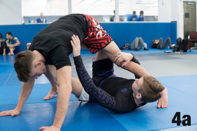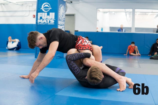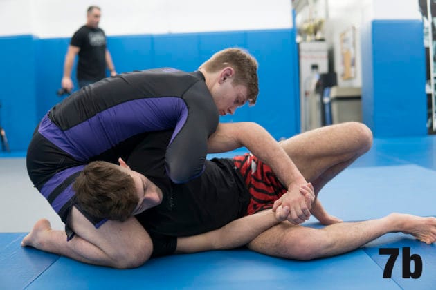 1a. While Ethan is on his knees, Nicky will initiate from the Sitting Guard by using his left hand…1b. …thumb down, to grab Ethan’s right wrist.2a. Nicky now transfers Ethan’s wrist.2b. He arm drags Ethan’s arm across his body…2c. …securing Ethan’s right hand against his right hip.3a. Nicky will now place his left foot on Ethan’s right hip…3b. …which will allow Nicky to have a “weightless” and free right foot.4a. Keeping his grips secure, Nicky will now lean back and shoot his free right leg over Ethan’s right shoulder.4b. As the distance closes and clamps his right calf down on Ethan’s back, making sure to keep his hips elevated and off of the mat.5a. Nicky will cross his ankles and feed his right arm to underhook Ethan’s left leg and…5b. …pivot on his back bringing his head towards the underhook.6. At this point, Nicky’s body position is perpendicular to Ethan with his legs parallel with each other. He may now lock up the triangle to catch the submission.