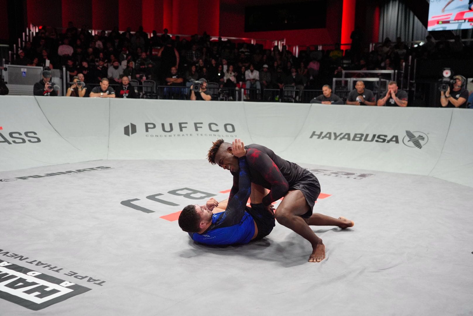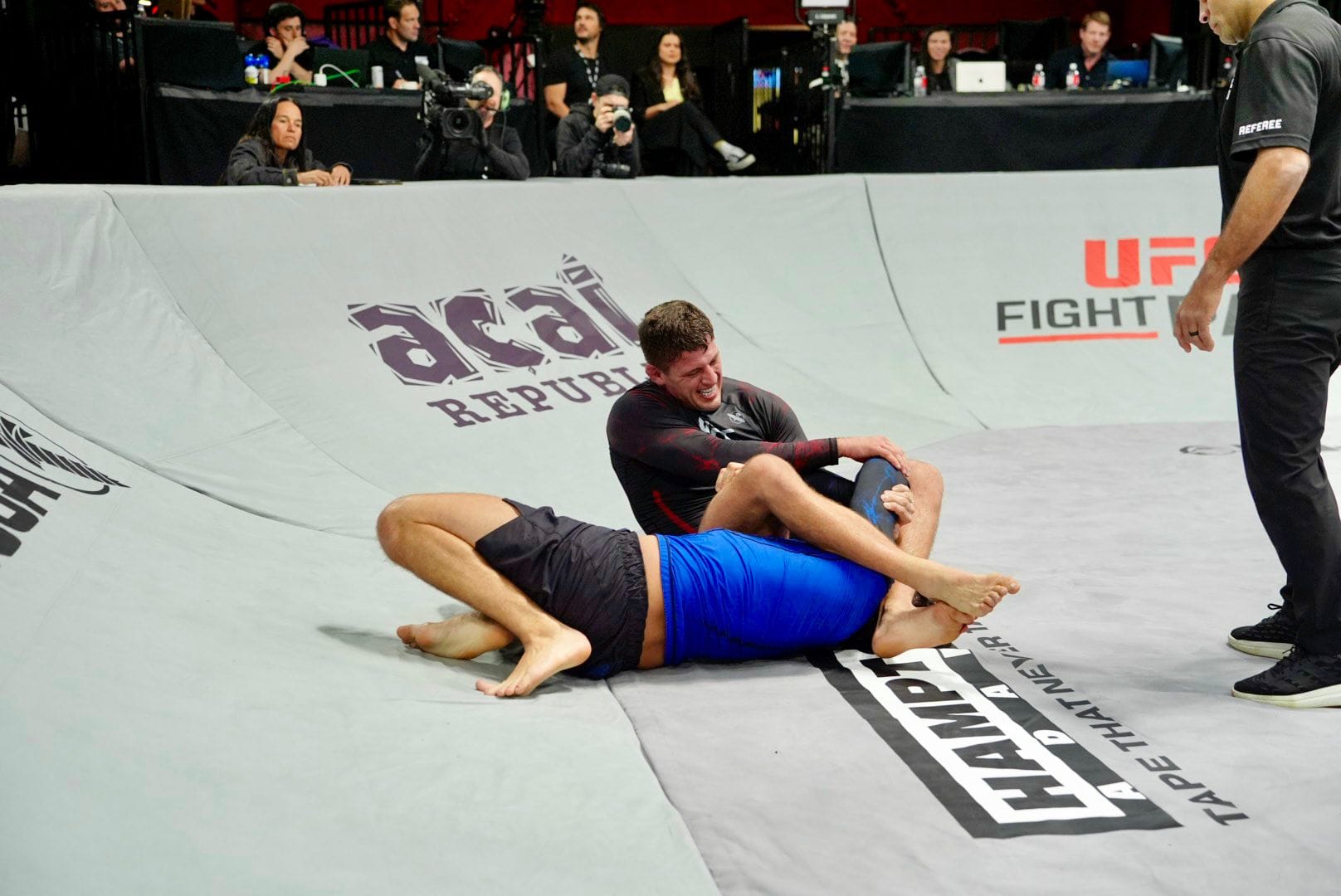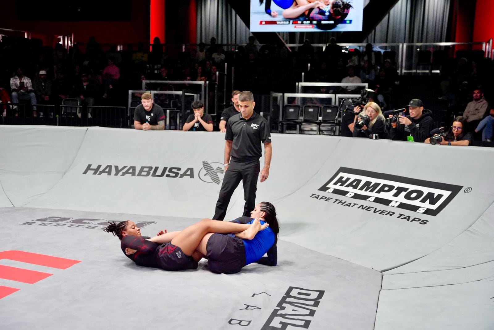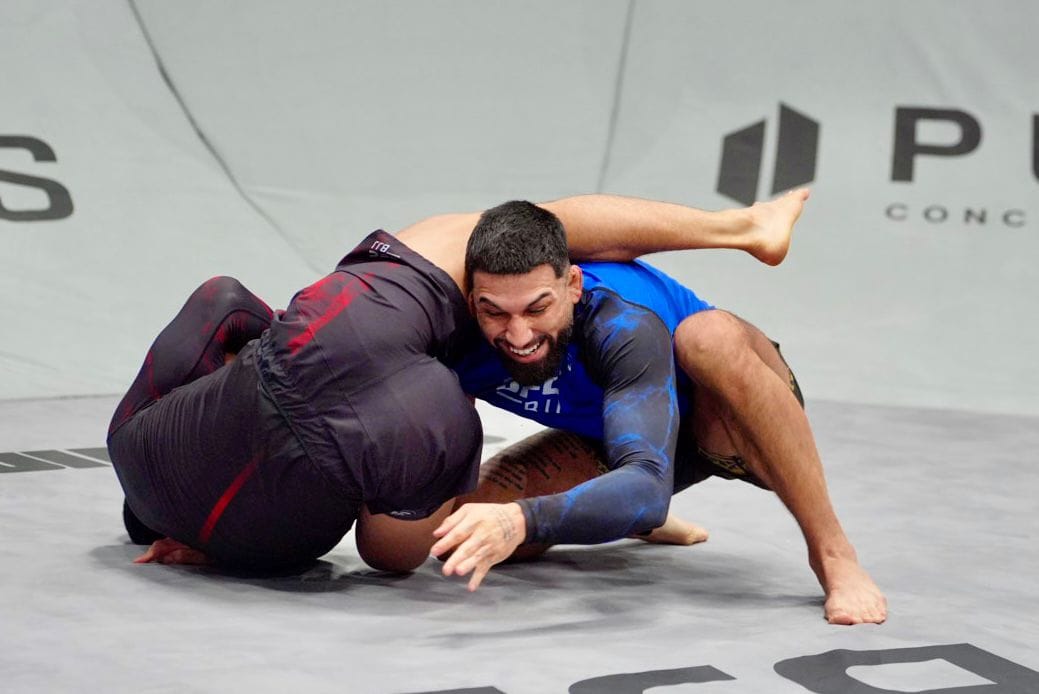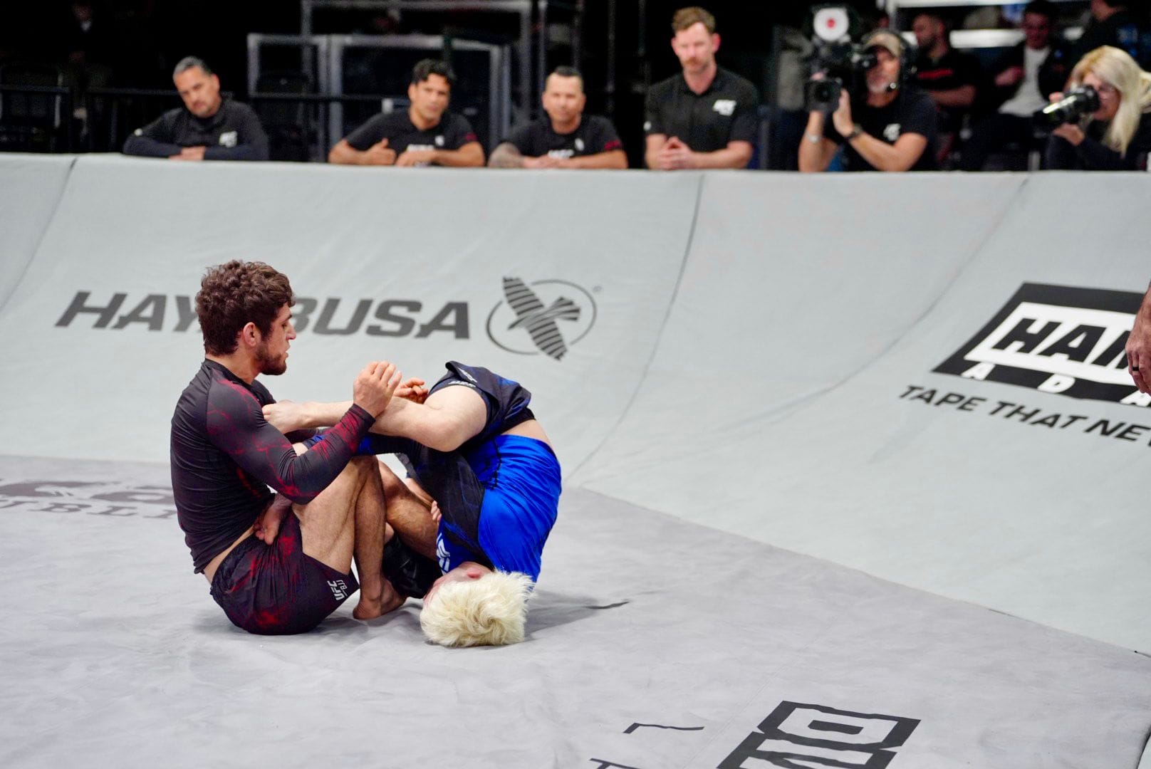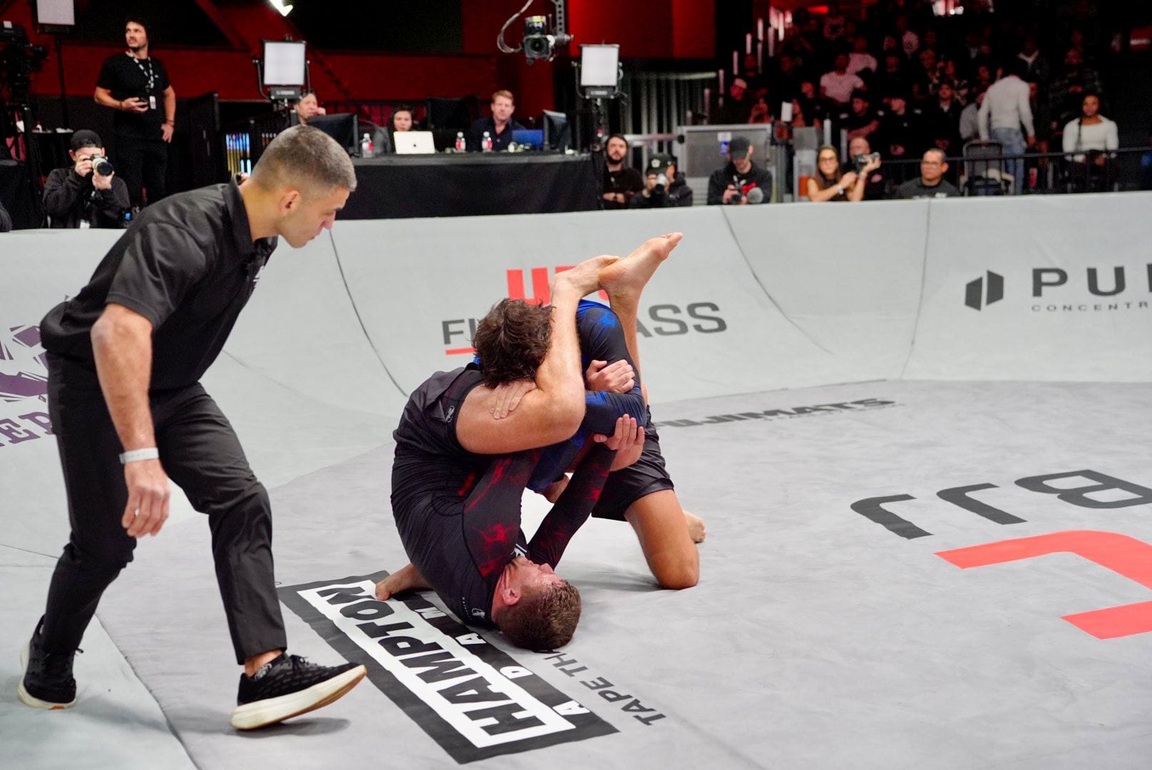 Heel hook attempts. Toe holds. Guillotine transitions. The second round featured a wild roll halfway up the Bowl wall before Brunacio reversed position.