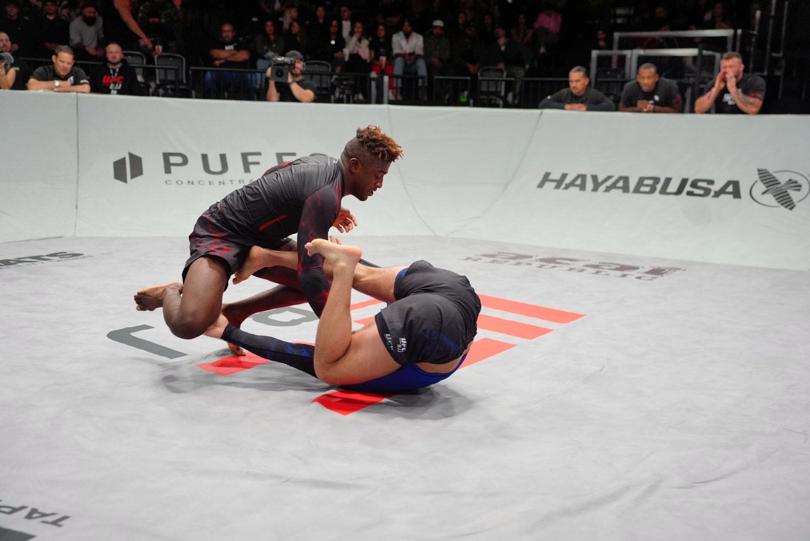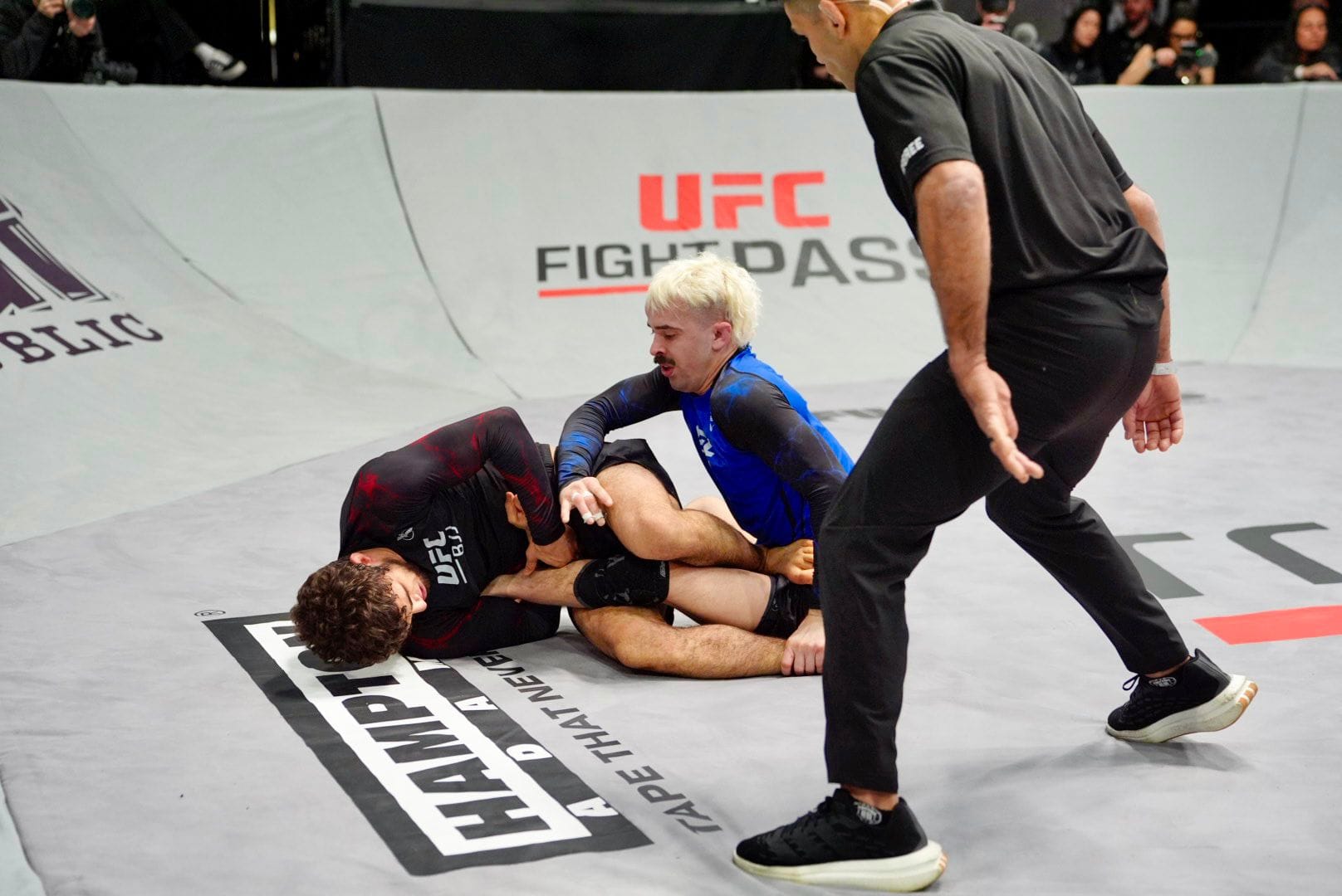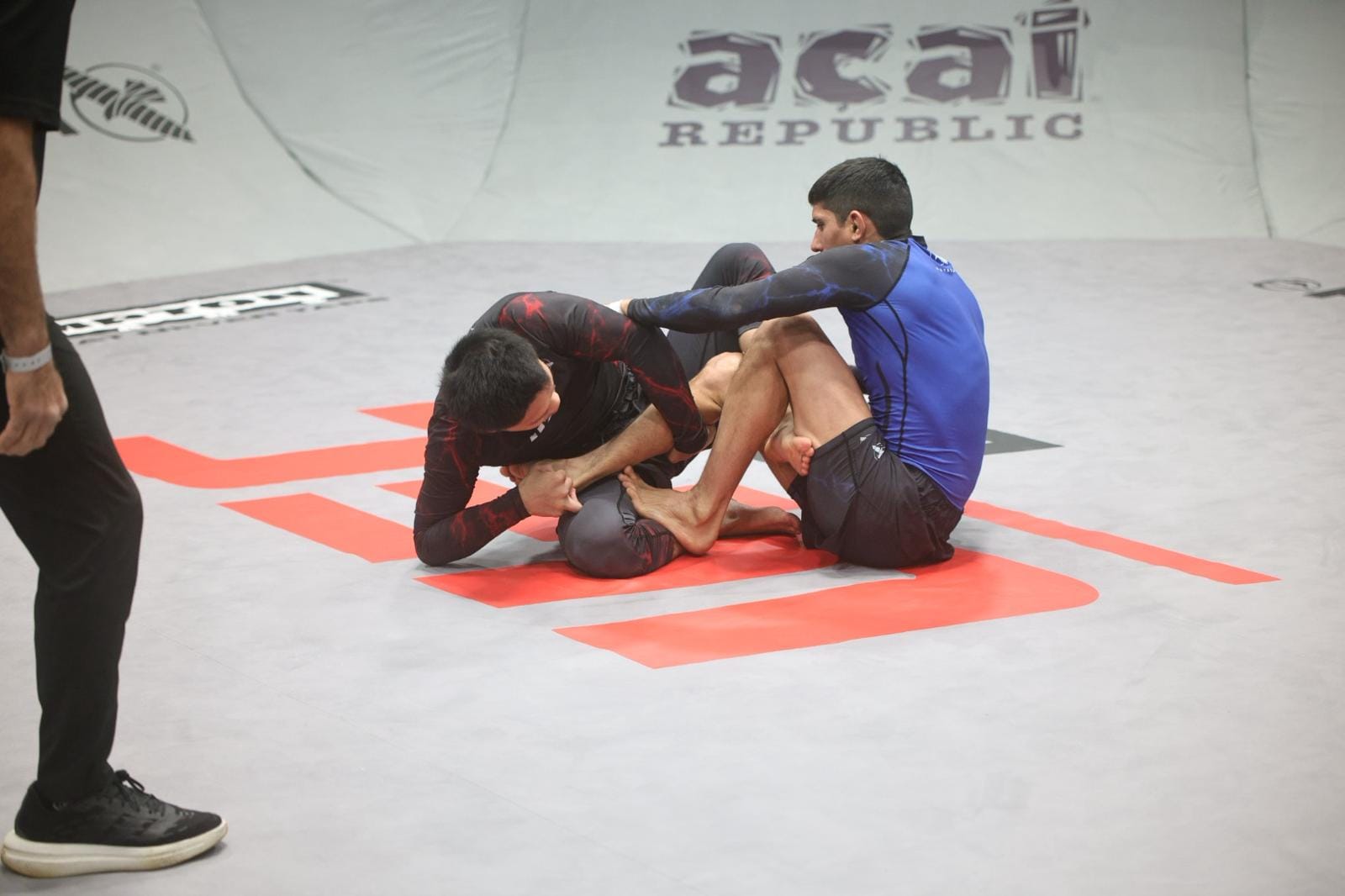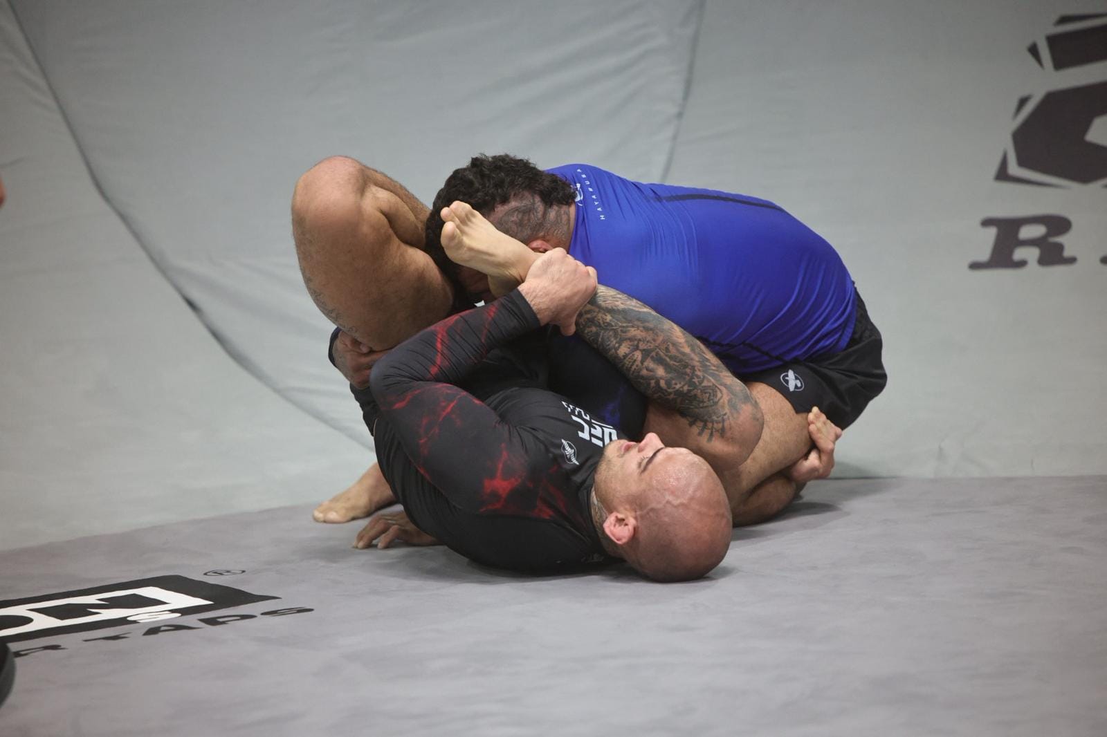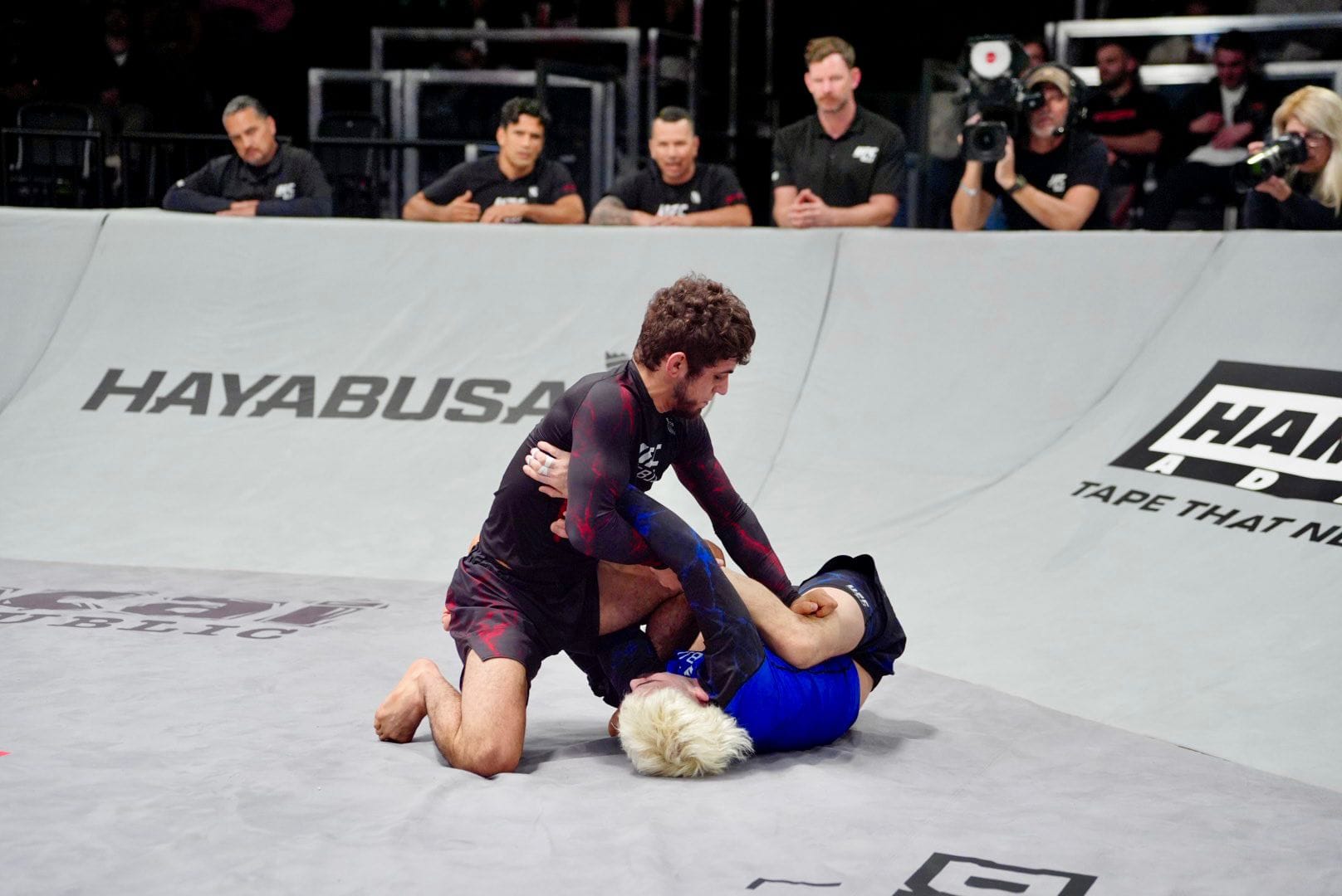 Heel hook attempts. Toe holds. Guillotine transitions. The second round featured a wild roll halfway up the Bowl wall before Brunacio reversed position.