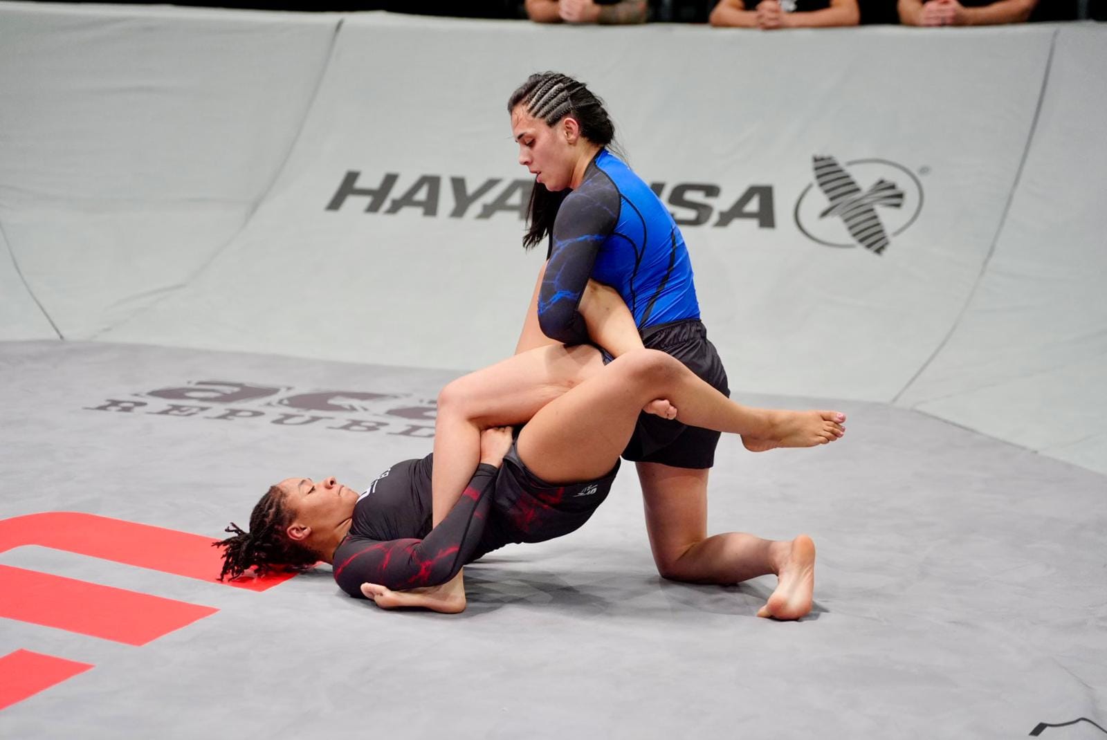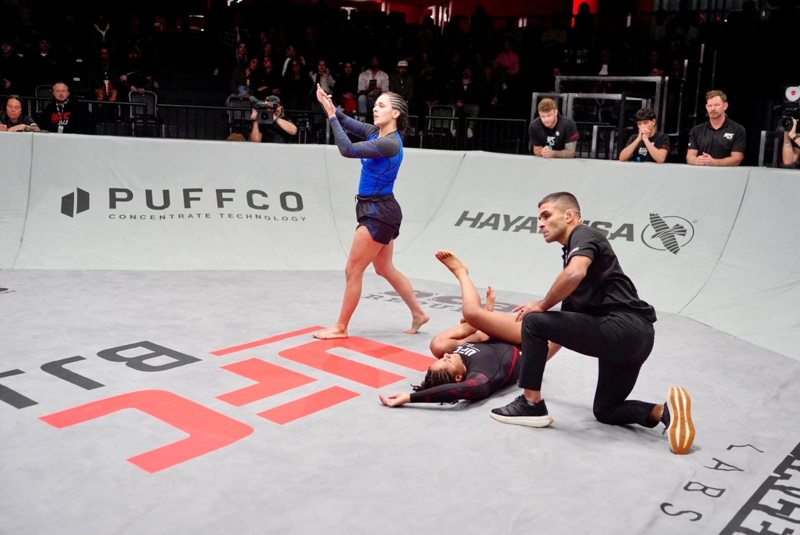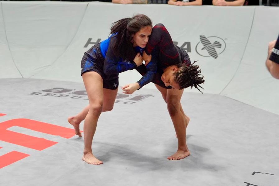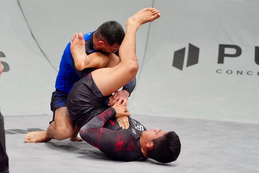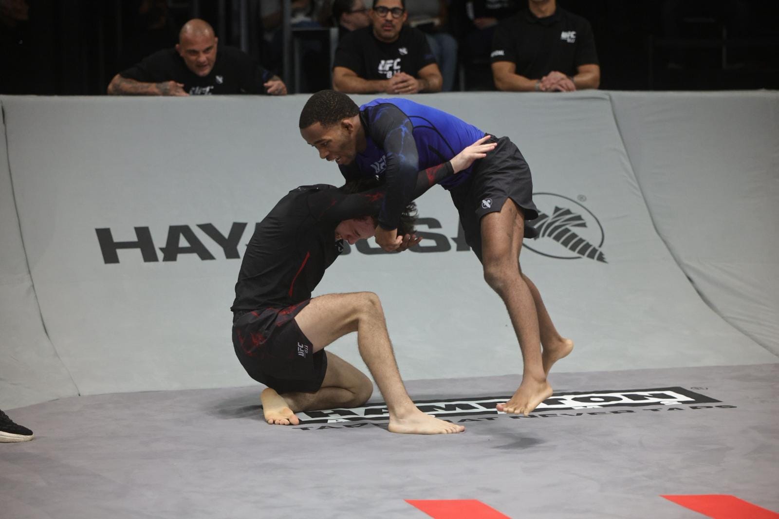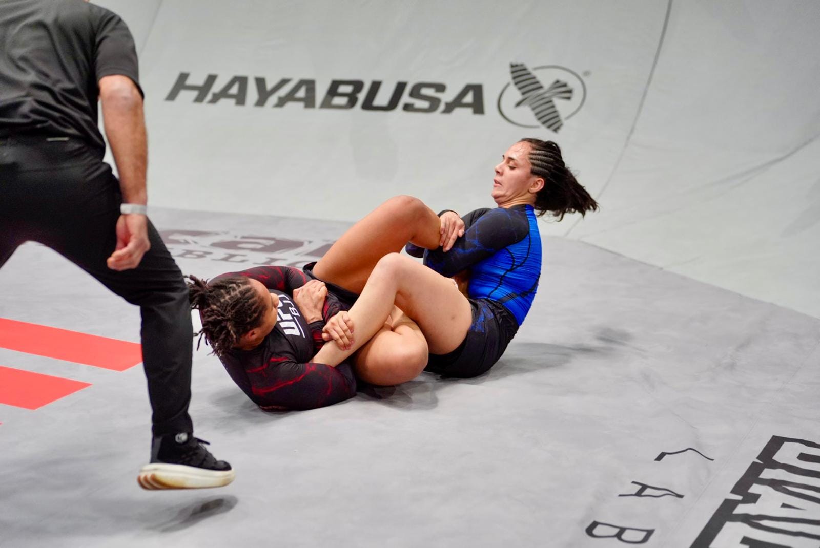 Heel hook attempts. Toe holds. Guillotine transitions. The second round featured a wild roll halfway up the Bowl wall before Brunacio reversed position.